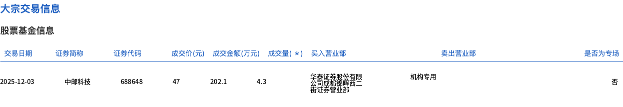 12月3日,中邮科技大宗交易成交4.3万股,成交额202.1万元,占当日总成交额的0.89%,成交价47元,较市场收盘价52.74元折价10.88%。